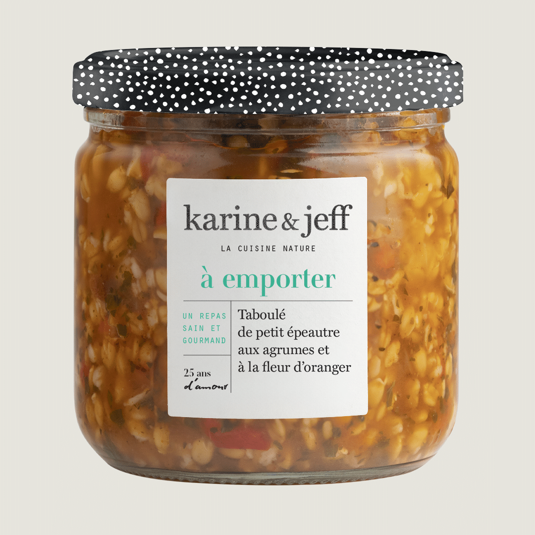 At Karine & Jeff, the quality of our ingredients is paramount. Our Small Spelt Tabbouleh with Citrus and Orange Blossom is crafted from organic components like French tomatoes, red peppers, onions, small spelt, orange peel, sultanas, and more. Each bite celebrates authenticity and pure flavor.